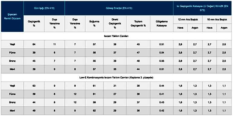 Yukarıdaki Isıcam değerleri 6 mm kalınlığında Şişecam Yüksek Reflektif dış cam +12/16 mm ara boşluk +6 mm kalınlığında iç cam düzeninde oluşturulmuş Isıcam’lar için verilmiştir.